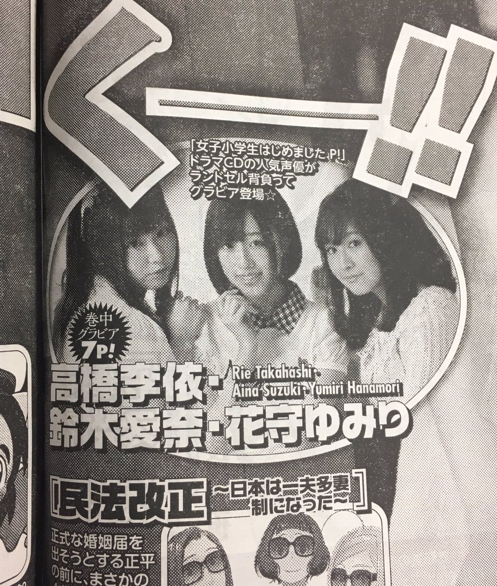 【画像】ヤングアニマルさん、声優にとんでもないコスプレをさせてしまう 2017年05月15日 カテゴリ:声優 mixiチェック 1 :風吹けば名無し@\(^o^)/ 2017/05/12(金) 16:14:14.54 ID:b6yWu1iC0.net ヤングアニマル編集O野木 @ya_onogi 5/26発売ヤングアニマル11号に「女子小学生はじめましたP!」ドラマCD声優さん方の グラビア掲載が決定です☆高橋李依さん、鈴木愛奈さん、花守ゆみりさんが女子小学生に なりきった鮮烈グラビア、お楽しみに☆ 5/26までオフショットを公開していきますね、まずは鈴木さん&3ショット☆ https://twitter.com/ya_onogi/status/862882873505861633 4 :風吹けば名無し@\(^o^)/ 2017/05/12(金) 16:15:34.38 ID:KV+fLW9ba.net で? 【【画像】ヤングアニマルさん、声優にとんでもないコスプレをさせてしまう】の続きを読む